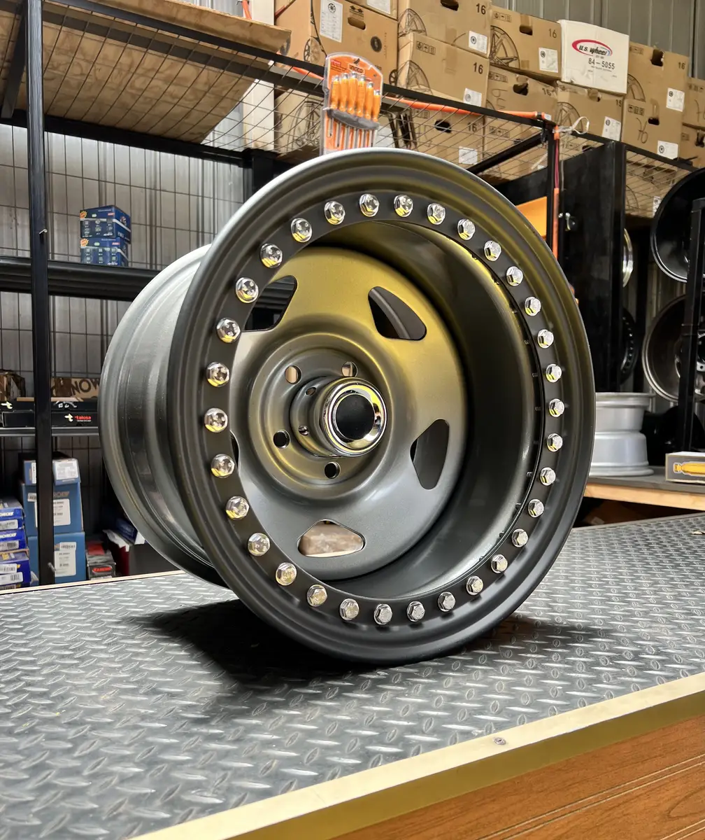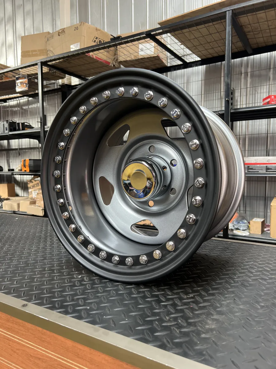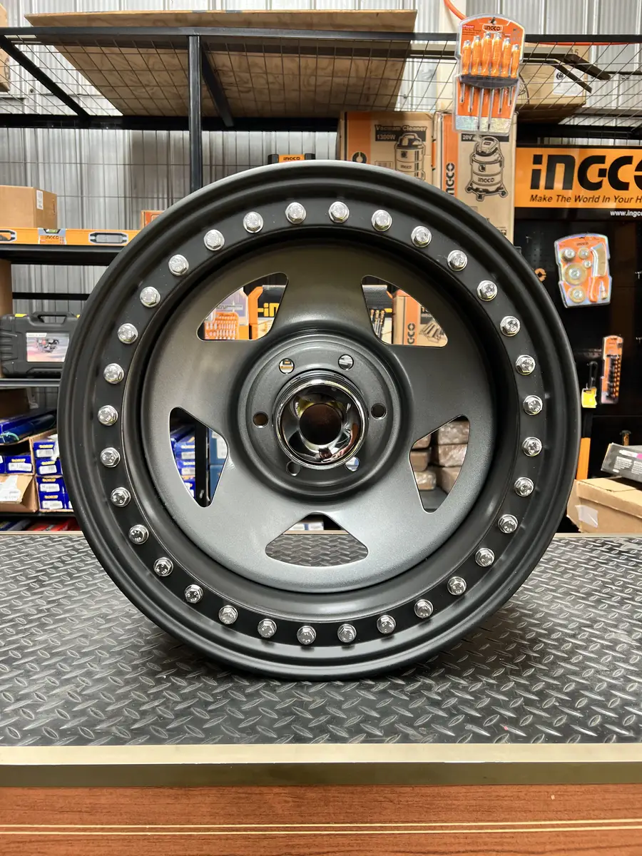 Llanta beadlock de 15×10 pulgadas. Llanta con sistema beadlock que asegura mecanicamente el neumatico al aro mediante un anillo de retencion atornillado. Permite rodar con presiones ultra bajas (hasta 5 PSI) sin riesgo de desllante. Esencial para off-road extremo en rocas, arena blanda y barro.