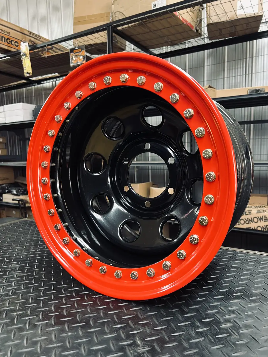 Llanta beadlock de 16×10 pulgadas. Llanta con sistema beadlock que asegura mecanicamente el neumatico al aro mediante un anillo de retencion atornillado. Permite rodar con presiones ultra bajas (hasta 5 PSI) sin riesgo de desllante. Esencial para off-road extremo en rocas, arena blanda y barro.